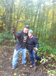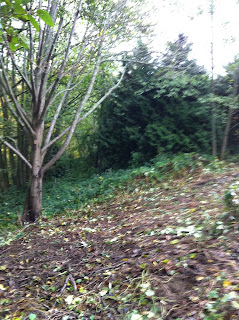 The plan was to remove invasives from several severely affected areas around the Park entrance, and plant about a dozen native conifers and shrubs in targeted areas. In the Blackberry areas, first we cut the canes, and piled them on the ground, and then we dug out the Blackberry roots, placing them on top of the pile of canes.